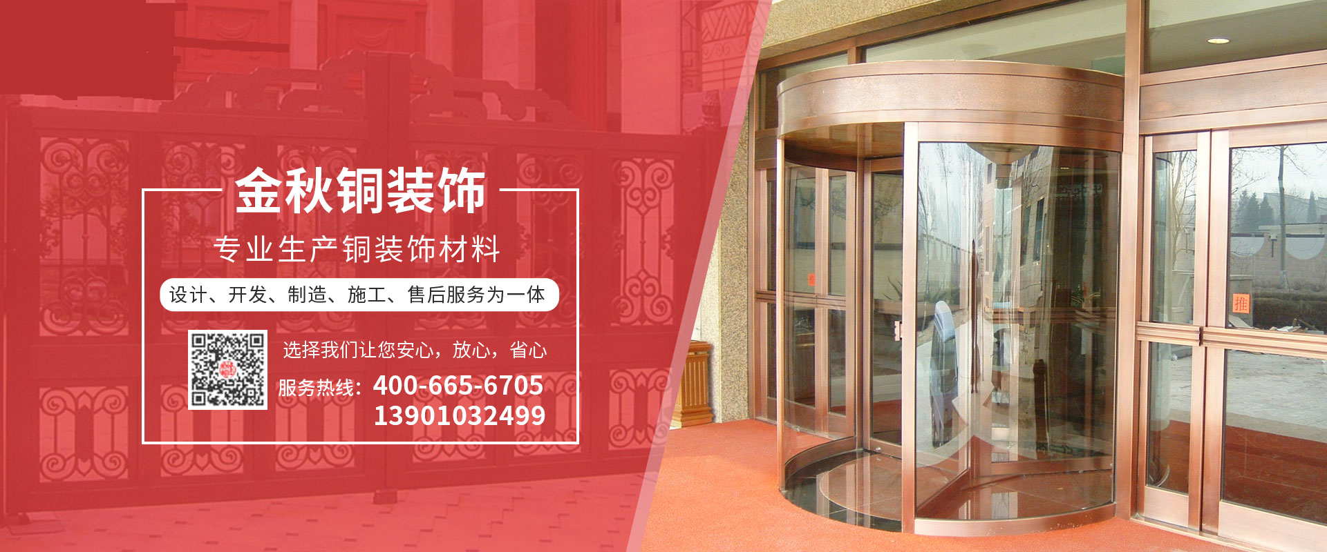 北京金秋銅裝飾材料有限公司是專業(yè)生產(chǎn)銅裝飾材料及設(shè)計(jì)、開發(fā)、制造、施工、售后服務(wù)為一體的大型綜合企業(yè)。可承接建筑銅裝飾工程及五星級(jí)酒店、別墅、博物館、樓樘管所等高檔銅裝飾項(xiàng)目;生產(chǎn)各種規(guī)格的旋轉(zhuǎn)門、平滑門、別墅門、電控門、工藝門、旋轉(zhuǎn)護(hù)欄、屋頂銅飾防水瓦、浮雕壁畫......